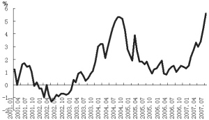 进入2006年11月,我国粮价再次出现突然上涨,涨幅由2006年10月的3.7%,迅速扩大到2007年1月份的6.9%。耐人寻味的是,此次粮食涨价发生在2004年-2006年我国粮食生产连续三年增产和库存充足的背景下。在我国政府对粮食市场加强调控后,粮价自今年2月份开始回落。但紧接着,猪肉价格上涨接过了粮价上涨的接力棒。“五一”长假后,全国各地的猪肉价格开始飙升。猪肉价格的上涨不仅带动了其他肉类价格上涨,还带动了鲜蛋、油脂等相关食品价格的上涨。2007年7月份,食品类价格同比上涨15.4%,涨幅比去年同期高14.8个百分点。