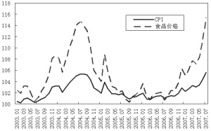 在2003年6月至2004年9月的CPI上涨中,粮食价格上涨引发的食品价格上涨是推动CPI涨幅上扬的主要原因。2004年1-9月,CPI累计上涨4.1%,食品价格上涨10.9%,其中粮食价格上涨28.4%。