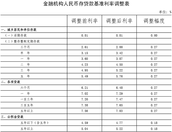 中新网9月14日电 为加强货币信贷调控,引导投资合理增长,稳定通货膨胀预期,中国人民银行决定,自2007 年9 月15 日起,上调金融机构人民币存贷款基准利率。金融机构一年期存款基准利率上调0.27个百分点,由现行的3.60%提高到3.87 %;一年期贷款基准利率上调0.27 个百分点,由现行的7.02%提高到7.29%;其他各档次存贷款基准利率也相应调整。个人住房公积金贷款利率相应上调0.18 个百分点。