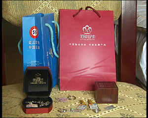 黄志宏:“这电视宣传是高清电视,这里面有一台也是,这电熨斗,它只有剃须刀是中国名牌的,他说这个也是中国名牌,这是名牌首饰,黄金是中国名牌的,钻戒就不是,稻花香的酒,它宣传湖北省委省政府接待专用酒,这个空调它宣传是全国销量第一。”