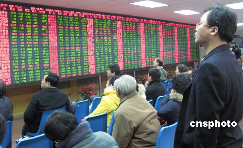 1月21日周一,中国股市现黑色星期一,沪深股市大盘在权重股合力引领下剧烈下跌。图为北京郁闷的股民以惊讶目光观察股市。中新社发 邹宪 摄