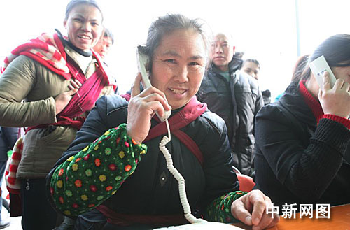 滞留旅客正在用免费公话向家里报平安。作 者:刘寰平
