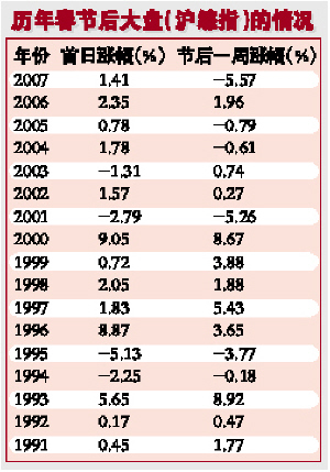 统计还显示,从1991年春节以来的17年中,只有4年春节后首个交易日市场没有“开门红”,分别是1994年、1995年、2001年、2003年。另外有13年,春节后首个交易日大盘均出现不同程度的上涨,占统计样本的近80%。(见表)