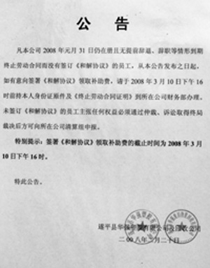 此后,遂平华强门口又张贴出公告,特别提示签署《和解协议》领取补助费的截止时间为2008年3月10日。