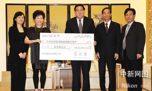 经纬集团董事局主席陈经纬先生委托夫人在香港向中央驻港联络办呈交支票
