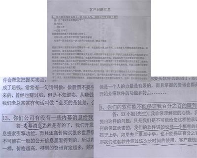 图片01:深圳晚报特稿部记者曾以应聘者的身份在金股之王呆了9天,他告诉记者,在这个话术里,详细归纳了每次给客户打电话应注意事项及如何说服不同类型客户。 图片来源:新华网