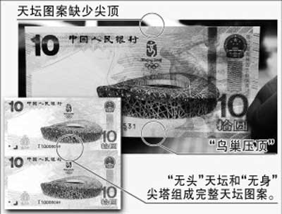 此次发行的奥运纪念钞正面主景图案为北京2008年奥林匹克运动会主会场——国家体育场建筑图案,其上方为第29届奥林匹克运动会会徽图案,背景辅以世界文化遗产——天坛剪影轮廓示意图。但一些收藏者发现,天坛的坛顶出现在“鸟巢”图案的下方。