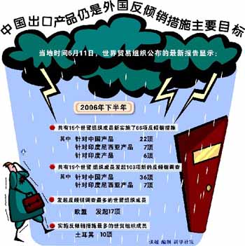 世贸组织早前发布的反倾销统计报告显示,从1995年至2006年,中国已连续12年成为世界上遭受反倾销调查和被实施反倾销措施数量最多的国家,2007年全球新立案的反倾销调查虽呈下降趋势,但中国仍然是全球反倾销调查的头号目标国。