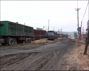 在离这家企业不远的一处私营煤矿门口,记者见到颇为壮观的场面,一些重型货车全是来拉电煤的,由于矿上库存不够,这些车辆只能在这等待现生产出来的电煤。