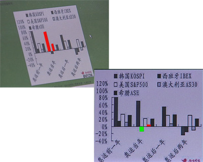 记者注意到,奥运召开的当年,韩国和美国的股市都有大幅上涨的表现,但与此相反的是,西班牙和澳大利亚的股市却是下跌或持平,那么,同为奥运举办的国家,股市的表现为什么却截然相反?
