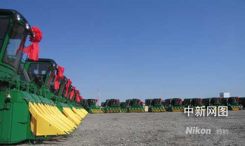 中新网石河子9月8日电 (记者 杨东)9月8日上午,60台国产大型采棉机浩浩荡荡,从新疆石河子市国家级经济技术开发区的生产车间驶出,奔赴植棉区。