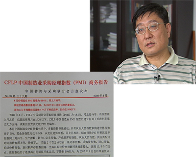 蔡进:“你看8月份的购进价格指数是57.8%,比上个月大幅回落13.5个百分点,这个是我们有记录以来最大的一个降幅。就任何指数以前都没有这么降过,它反应什么?应该说反应我们国家这个宏观调控的政策的措施出台以后对价格的控制是取得了明显的效果,价格的增长幅度的话,很可能会在今后几个月会有明显的回落。”