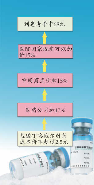 一般来说,厂家的药品先要经过物价部门的审批,物价部门根据药厂的申报制定价格。如盐酸丁咯地尔针剂,药厂购买盐酸丁咯地尔的价格是每千克4000元左右,生产250毫升的注射液含0.1克,即每瓶药含有的盐酸丁咯地尔为0.4元,加上氯化钠液体、包装和生产流程的花费,每瓶药的成本价不会超过2.5元,而到患者手中就变成了68元。这中间的近60元的分摊为, 一般医药公司要加17%的价格,中间商至少要加15%的价格,而医院国家规定可以加价15%。厂家在出厂之前都要计算好招标前的各各环节的费用,才好报价。而中间商在报招标价格前也要计算好医院各环节的利润分成。