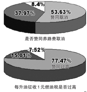 在是否赞同养路费取消,改成一升油征收1元燃油费的调查中,83043人赞成费改税,占53.63%,有58799人反对费改税,占37.97%,而另有13003人表示不好说,占8.4%。该调查显示,到记者截稿为止,赞同费改税的网民超过半数,显著高于其他两种意见。
