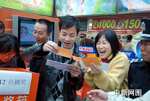 在广东春节国内游首场热卖会上,抽奖时中奖的游客兴高采烈。胡银汉摄