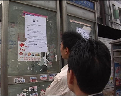 这就是他们俩头一天交钱的地方,如今已是人去楼空,李美锐和肖方云白白损失了20块钱,不过最终在记者的建议下,两人还是在几经打听后,来到了附近的一个劳动力市场,这是个很正规的中介机构,但在市场转了一会后,两人又碰到了一个难题。