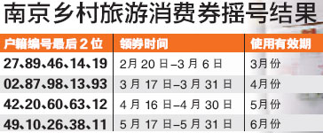 此次发放活动的旅游券消费时间为3月-6月,不过乡村旅游消费券标有使用月份,按月使用,有效期为当月。本次摇号方式,根据江南八区居民户口簿编号的最后两位数字进行摇号,分别摇出3、4、5、6月份乡村旅游消费券的发放户口簿号码,每个月为一组,每组为5个号码。