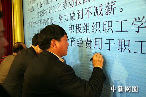 记者在现场看到,《共同约定书》中企业方的承诺主要是:企业依法采取缩短工时,适时安排年休假和特别休假、轮岗轮休等形式保障职工岗位,做到不减薪、不裁员或少裁员。企业要组织职工学习新技术,而且企业教育经费用于职工培训不少于70%。另一方面,职工方作出了立足本职、爱岗敬业、积极为企业发展献计出力等承诺。