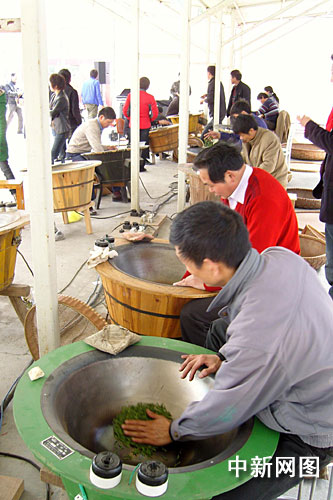 3月25日上午8时,刚下过濛濛细雨的天空渐渐放晴,西湖区2009年西湖龙井“炒茶王”争霸赛在龙坞茶叶交易中心顺利举行。说来也巧,在首轮抽签环节中,两位往年的“炒茶王”相继抽到了1号和2号,面对面地形成了“炒茶王”争霸赛的第一个高潮——“双王争霸”的精彩场面。为公平比赛,此次所有参赛选手炒制的青叶原料都来自同一块茶地。比赛中,每位选手都领到了2斤青叶,在经过杀青、辉锅、整理、二次辉锅等工序后,以抽签号装袋后送由国家级一、二级评茶师和龙井茶叶产业协会秘书长等评茶高手组成的评审团评审。评审团则通过观、闻、品等方法,对各位选手炒制的茶叶外形、香气、滋味、汤色、叶底等进行打分,最后以综合得分的高低产生“炒茶王”。
