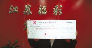 4月2日上午,中奖者刘京(化名)来到江苏福彩中心领走巨奖。