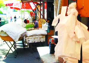 食品市场对面,几家批发塑料制品的小铺挨在一起。问及“限塑”之后生意有什么变化?店家的答案是:超薄的小袋儿没有了,但其他袋子的出货量并没减少,生意跟以前差不多。