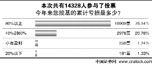 上周,中国证券网进行了“今年来您投基累计亏损为多少”的调查,获得了投资者广泛关注,共有14328人参与了投票。结果显示,有10909名投资者损失达到了80%以上,达到全体投票者总数的76.14%。选择亏损在40%-60%的基民人数为2978,占投票者总数的20.78%。191名投资者损失低于20%,占投票者总数的1.33%。只有250名基民表示,今年以来小有盈利,仅占全部投票者的1.74%。