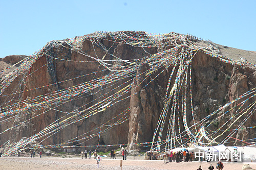 纳木措湖边的圣石,挂满了藏民的经幡。