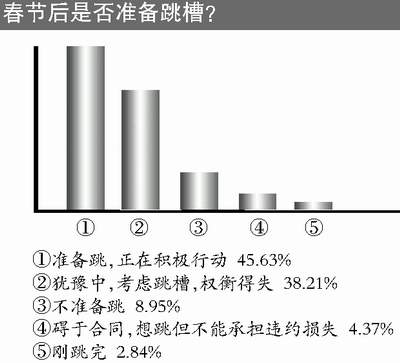 春节过后,多数公司给员工发了年终奖,领到年终奖后,一些员工则把自己的“年终总结”写成了“辞职报告”交给老板。职场中的您是否也准备跳槽?在本报与搜狐网联合进行的网上调查显示,四成多投票者有跳槽意向,并且正在积极行动。