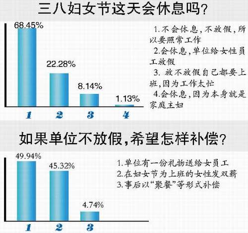 调查中,有近七成(69.04%)投票者选择了希望国家把3月8日设置为女性的法定假日,体现社会对女性的更多关心。而事实上,3月8日已经或许正是因为很多单位没有给女性员工放假,也没有任何表示,导致很多人根本不知道有这样一个规定。