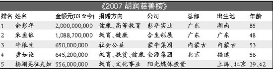 85岁的余彭年仍是中国最慷慨的慈善家;朱孟依捐赠价值10亿元的股份排名第二;牛根生承诺捐出全部股份,其已捐出的价值约为6.5亿元,排名第三。今天下午,“胡润百富”第四次推出“胡润慈善榜”。
