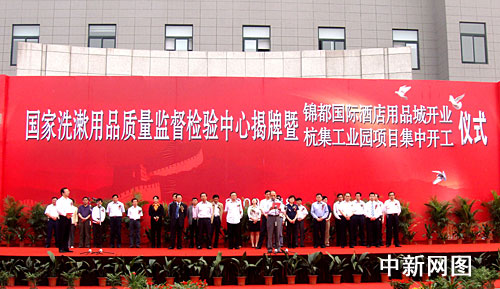 中新网邗江五月十八日电(记者 崔佳明 马春阳)五月十八日,江苏邗江在杭集镇举行国家洗漱用品质量监督检验中心揭牌暨锦都国际酒店用品城正式开业、杭集工业园项目集中开工仪式。中国轻工业联合会综合业务部副主任查长全、省质监局副局长张亚青、扬州副市长闻道才、邗江区委书记程裕松、区长韩方等领导出席,活动由区长韩方主持。