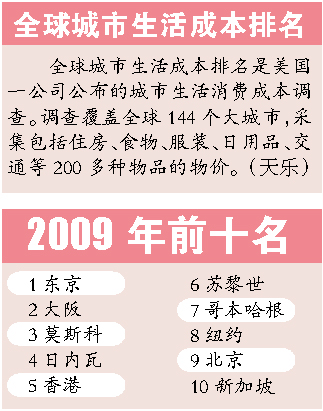 美国美世咨询公司6日公布的“2009年度全球城市生活成本排名”中,日元升值使东京和大阪占据了“全球最贵城市”排名头两把交椅,而英镑的贬值则令伦敦在近十年来首次跌出该项排名前十位。