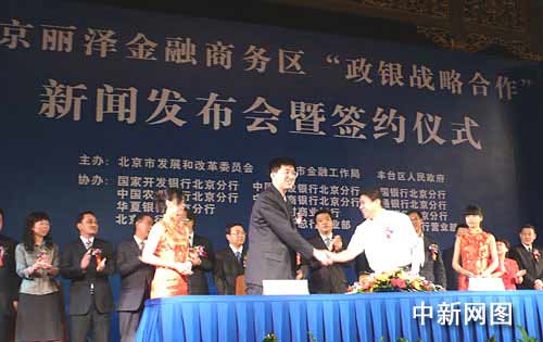 签约仪式上,北京丽泽金融商务区开发建设指挥部办公室与国家开发银行、建设银行、中国银行、农业银行、工商银行、交通银行、华夏银行、北京农商行、兴业银行、北京银行、中信银行、民生银行等12家银行的北京分行,分别签署了“政银战略合作”协议。