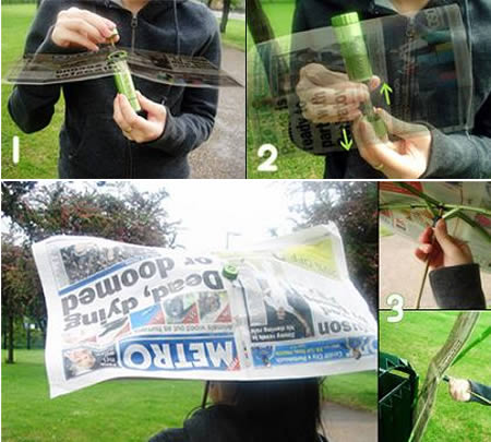 5:轻便雨伞:普通伞再小巧也会有固定的支架和伞布。这款雨伞就不一样了,只有一个活动的支架,你可以任意时间任何地点随便支开,至于伞布更是方便,仅用一张报纸就可以遮风避雨了。
