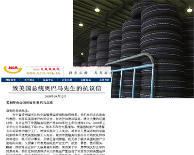中国橡胶工业协会会长范仁德:“知道美国政府裁决了特保案之后,协会立刻就做出了反应,首先是在中国橡胶网,发布了对奥巴马的抗议信,表示中国的轮胎协会和中国的涉案企业,对奥巴马裁决特保案,表示了最大的遗憾和坚决的反对,和抗议。”