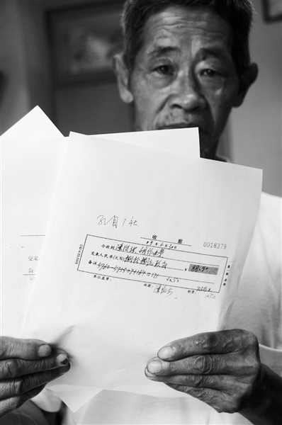 ●重庆江津区李市镇孔目村一社的一名电费收费员,手持农民的电费缴纳单据。上面显示着孔目村一社农民陈治洪,2009年6月共用电7度,却分摊了164度电的损耗,实际缴纳电费88.9元,平均每度电12.7元。