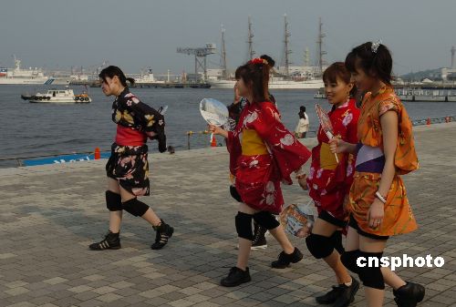 日本横滨举行颇具规模的“开港祭”,纪念其开港。图为一群身着当地开港早期少女服饰的日本女孩前来凑热闹。中新社发 王健 摄