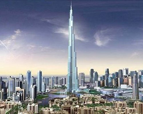 迪拜塔又称迪拜大厦或比斯迪拜塔,有162个楼层,总高度818米,比台北101足足高出310米。迪拜塔由韩国三星公司负责营造,在2004 年9月21日开始动工,预计将在今年12月底前完工启用,总耗资约800亿美元。2007年初开始已有玻璃帷幕安装,而金属外墙也于2007年6月开始施工安装。