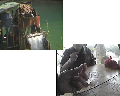 这些淘金船,有的停泊在河道中间,有的停靠在河床边。它们是怎么淘金的?记者寻找到一处隐蔽位置,拍摄了一条淘金船的作业过程。只见船体把河道里挖的沙石通过传送带送到高处,倾倒在淘金船的过滤槽上,一边喷水进行分层过滤,大的沙石从过滤板上面重新滚落到河里,细沙则通过右侧的木槽水洗后收集到另外一条船上。那么,淘出来的金子在哪儿?
