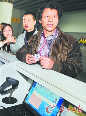 来自湖南邵阳、在中山横榄镇某建筑工地做泥水工的唐结元成了今年春运广州实名制火车票查验进站的第一人。昨天下午2时不到,他扛着行李来到琶洲展馆候乘点验证台前。工作人员先将机票二维码放在扫描器处扫了一下,电脑屏幕显出L7688次车票的信息,还有唐结元的姓名和身份证号码。接着她又将唐结元的身份证放在阅读器上,电脑屏幕又显示出唐结元的个人信息。接着,屏幕显示“通过”字样。工作人员随即在车票上盖上“广铁集团广州火车站实名验讫”的章。整个过程不超过20秒。据悉,对于一代证和其他十几种的购票证件都需要人工验票。