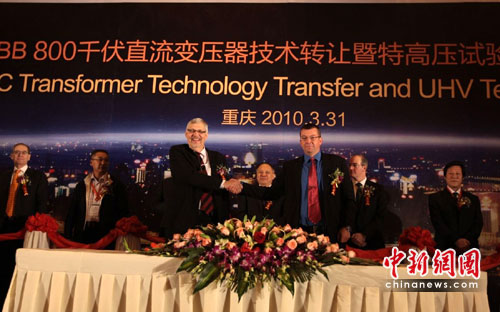 中新网重庆3月31日电(记者 郭虹)31日,位居全球500强之列的电力和自动化技术领域的厂商ABB集团在渝签署协议,将800千伏高压直流变压器技术转让给其在华企业——重庆ABB变压器有限公司;同时,ABB特高压试验中心亦在此落成。
