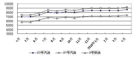 成品油零售价格小幅上涨。4月份,大中城市90号、93号、97号汽油和0号柴油实际零售价格每吨分别为8156元、8681元、9194元、7408元,与3月份相比,分别上涨2.77%、2.65%、2.55%、2.90%。