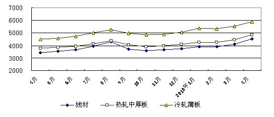 钢材价格大幅上涨。据对全国30个省(区、市)主要钢材市场监测,4月份国内主要钢材品种价格涨幅较大,其中,线材(普线6.5,Q235)、热轧中厚板(6,Q235)、冷轧薄板(1,Q235)全国平均价分别为4537元/吨、4876元/吨、5895元/吨,与上月相比分别上涨10.96%、9.28%、6.29%。