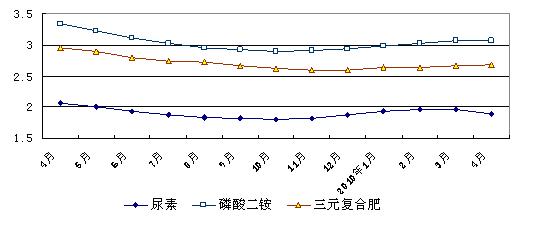 化肥价格稳中略降。4月份,国产尿素平均零售价格为每公斤1.89元,与上月相比下降3.57%;磷酸二铵、三元复合肥平均零售价格分别为每公斤3.07元、2.68元,与上月基本持平。