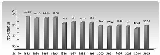 从国际口径统计结果看,我国劳动报酬占比的基本走势和国内口径统计相一致,但差距缩小。从1992年到2005年,除了2003年、2004年低于50%外,其他年份劳动报酬占比均在50%以上。