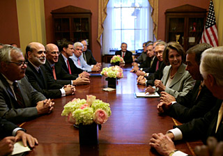在公布金融救援计划前,美国财政部长保尔森、美国联邦储备委员会主席伯南克和布什进行了紧急磋商;保尔森等官员随后又拜会多位资深议员,争取到了他们的支持。