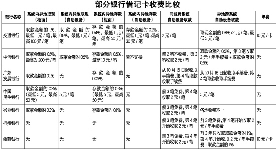 根据目前杭州各家银行公布的收费标准看,四大银行的银行卡收费标准是最高的。记者咨询了多家银行的收费标准,市民在选办银行卡时,不妨做个比较。(黄丹)