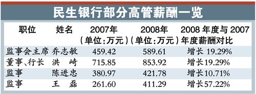 不过,董事、副行长洪崎在众高管降薪中独树一帜,升职加薪。去年薪酬达853.92万元,比上年增长138.07万元,“因工作原因职级调整,2008年薪酬比照行长执行。”民生银行在年报中解释。