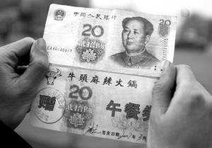 前天中午,于先生在北苑家园牛头麻辣火锅用餐后,饭店赠送一张面值20元的午餐券。于先生拿到返券后发现,除了部分字体不一样外,该返券完全模仿20元人民币样式。