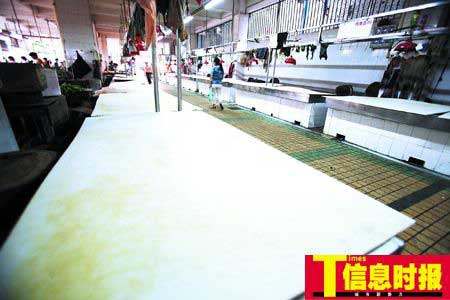 记者从白云区白灰场肉菜市场、犀牛角肉菜市场了解到,两家菜市生猪代宰费分别为75元/头、100元/头,昨天优质猪批发价为7.2元/斤。不仅如此,肉档指称,屠宰场提供的加工肉品质量每况愈下,“瘦肉好似注水肉、大猪偷换成小猪,偷割肉比以前严重。”